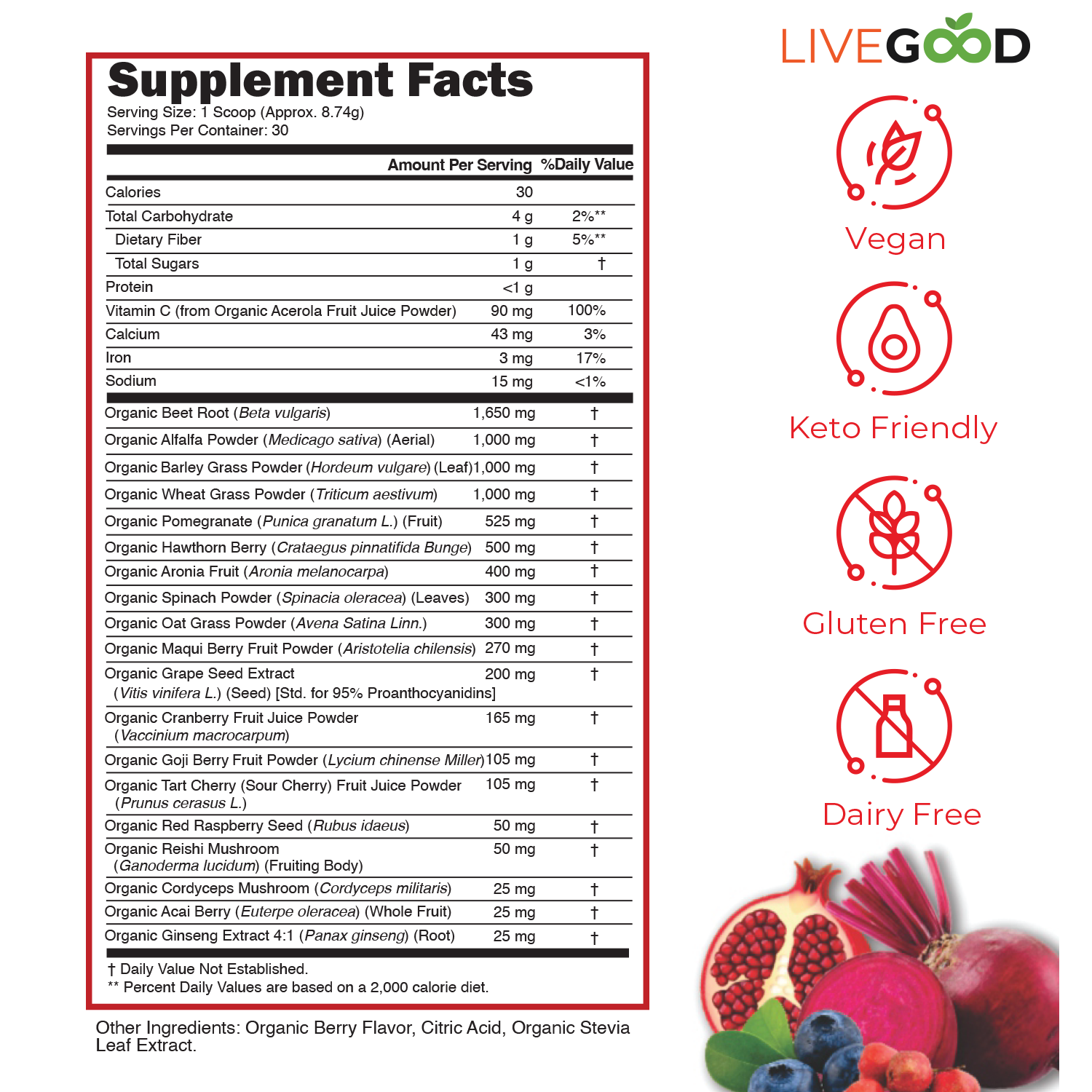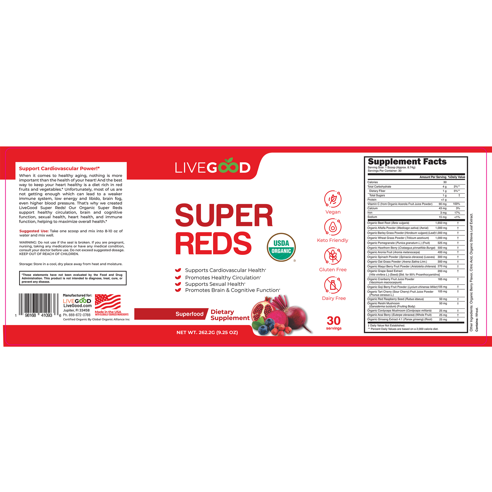 Our Organic Super Reds contain the highest amount of fruit and vegetable extracts known to help improve blood flow by increasing our body's production of Nitric Oxide, boosting blood circulation, supporting brain and cognitive function, sexual health, heart health, immune function and helping to maximize your body's overall health!
